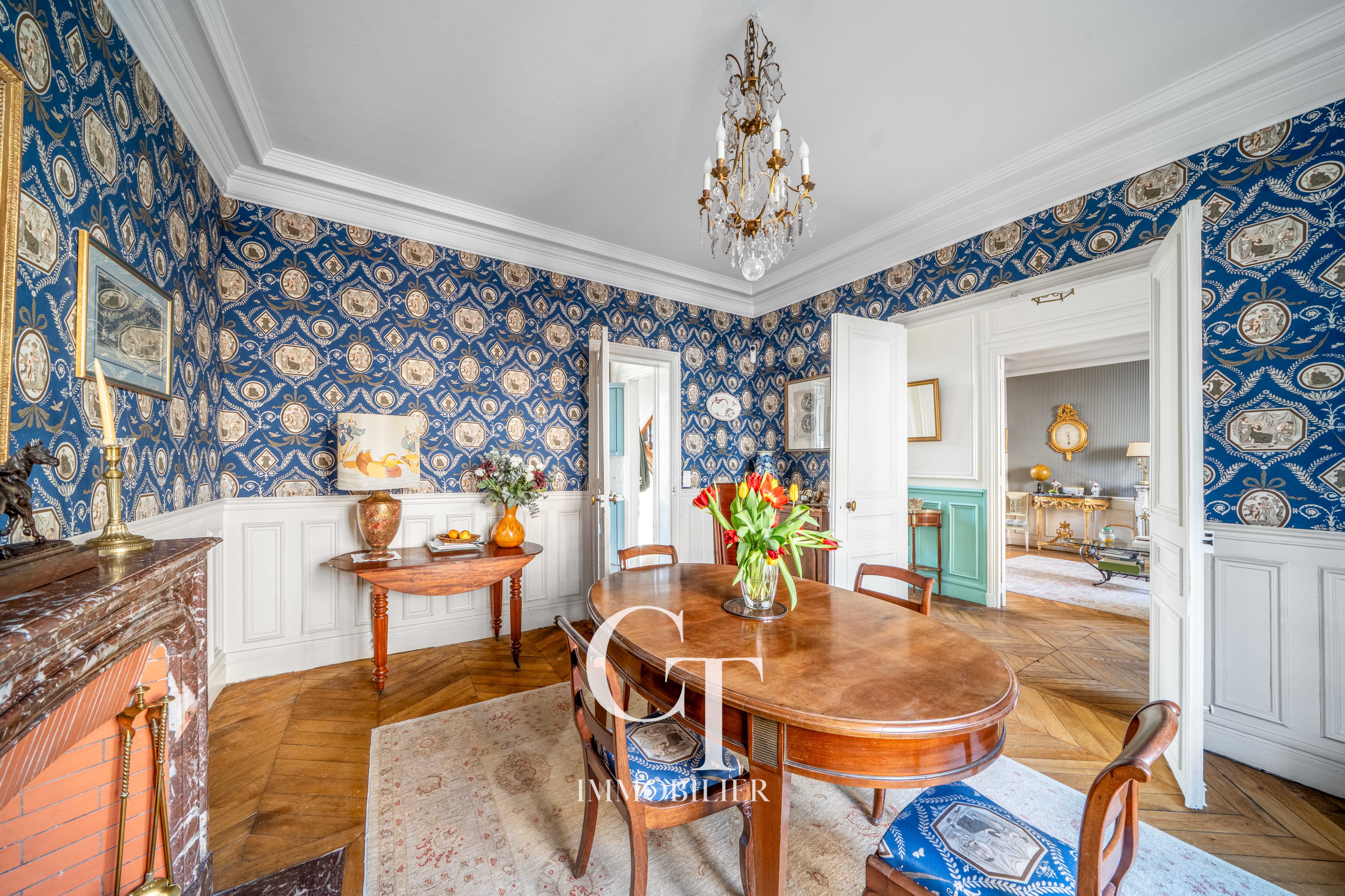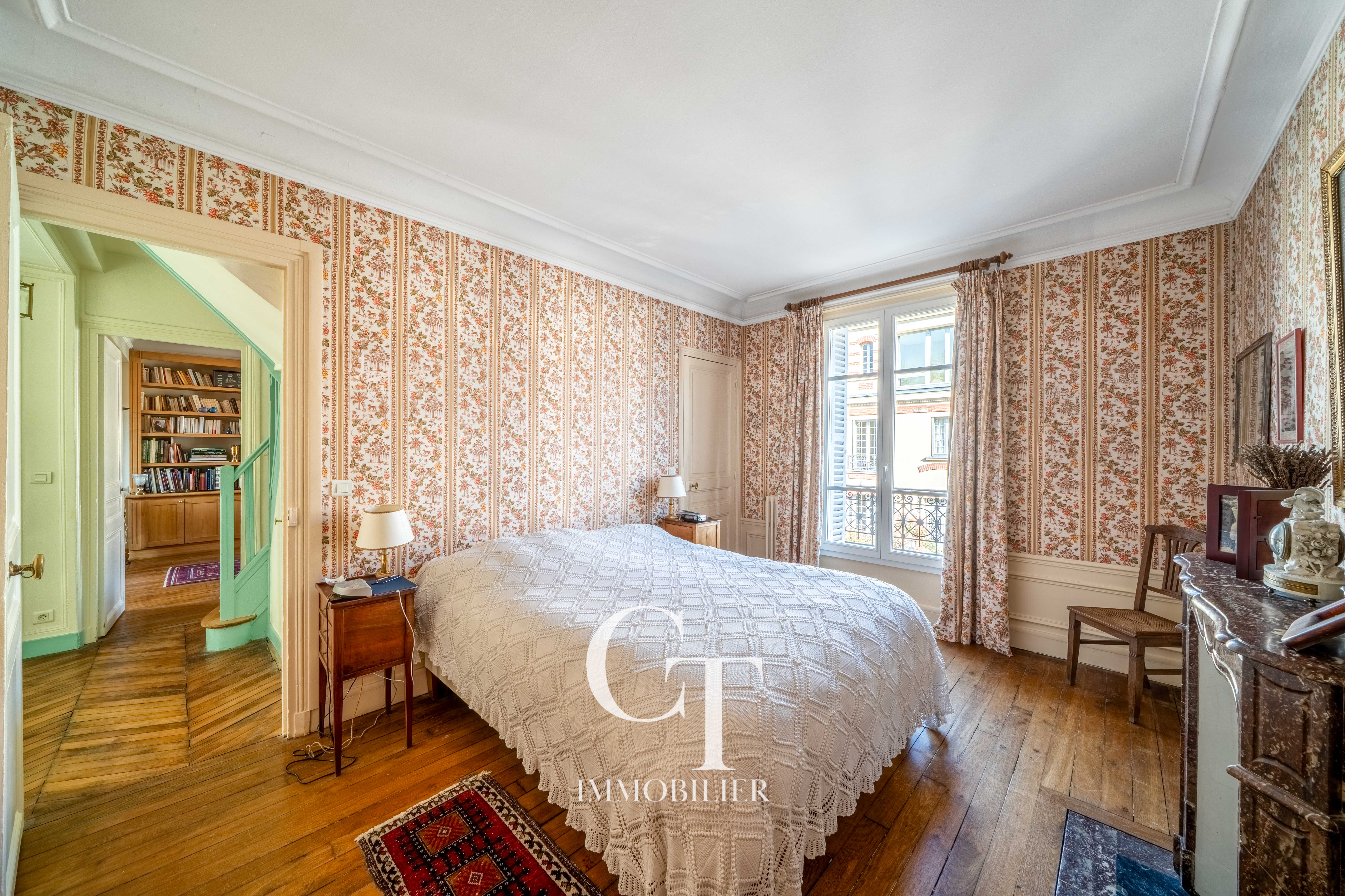 Le double séjour, sublimé par une cheminée, des parquets anciens et de belles hauteurs sous plafond, dialogue harmonieusement avec une salle à manger indépendante, elle aussi dotée de sa cheminée, prolongée par une cuisine tournée vers le jardin.
